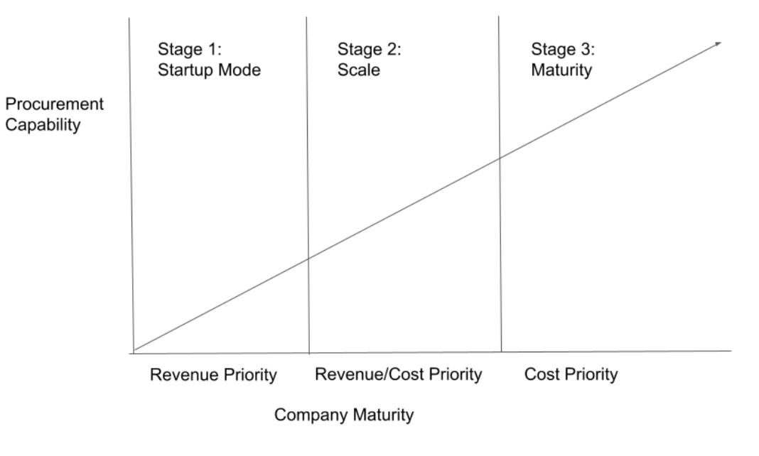 Procurement capability can be simplified and broken up into three main stages: startup, scale, and maturity.